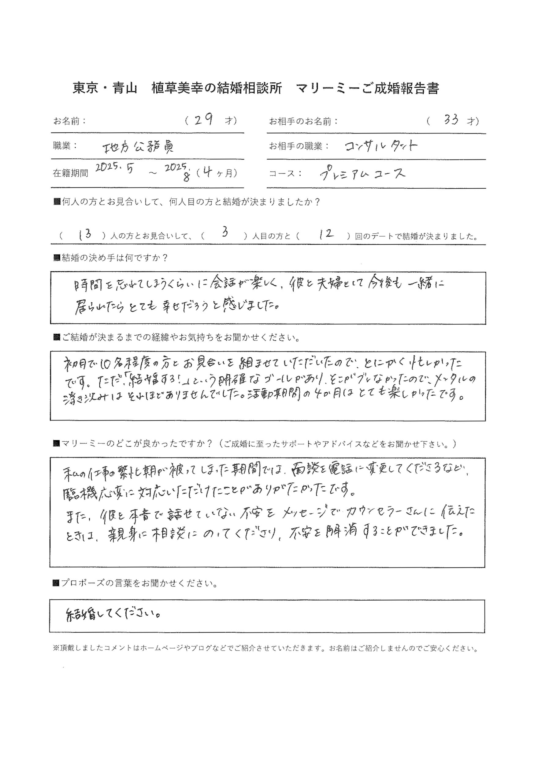 29歳地方公務員女性×33歳コンサルタント男性のご成婚