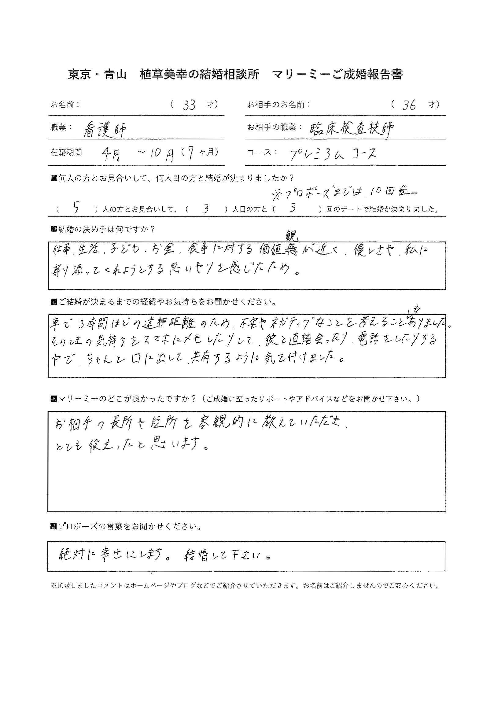 33歳看護師女性×36歳臨床看護師男性のご成婚