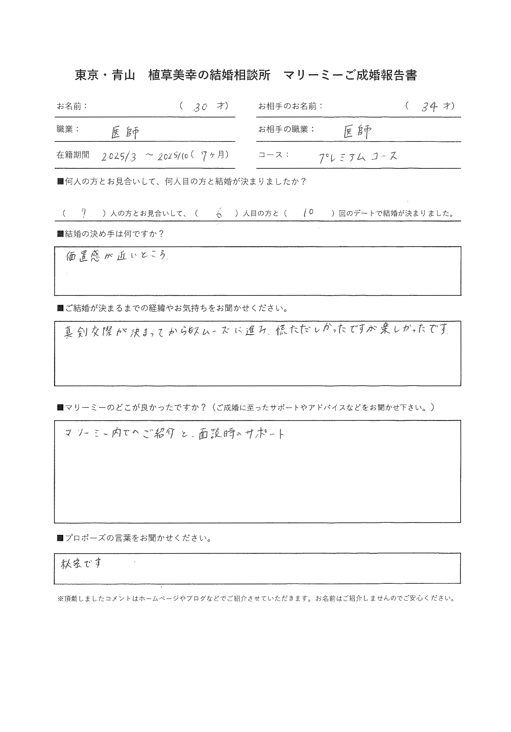 女性30歳 職業 医師 (プレミアムコース 活動期間7か月)
