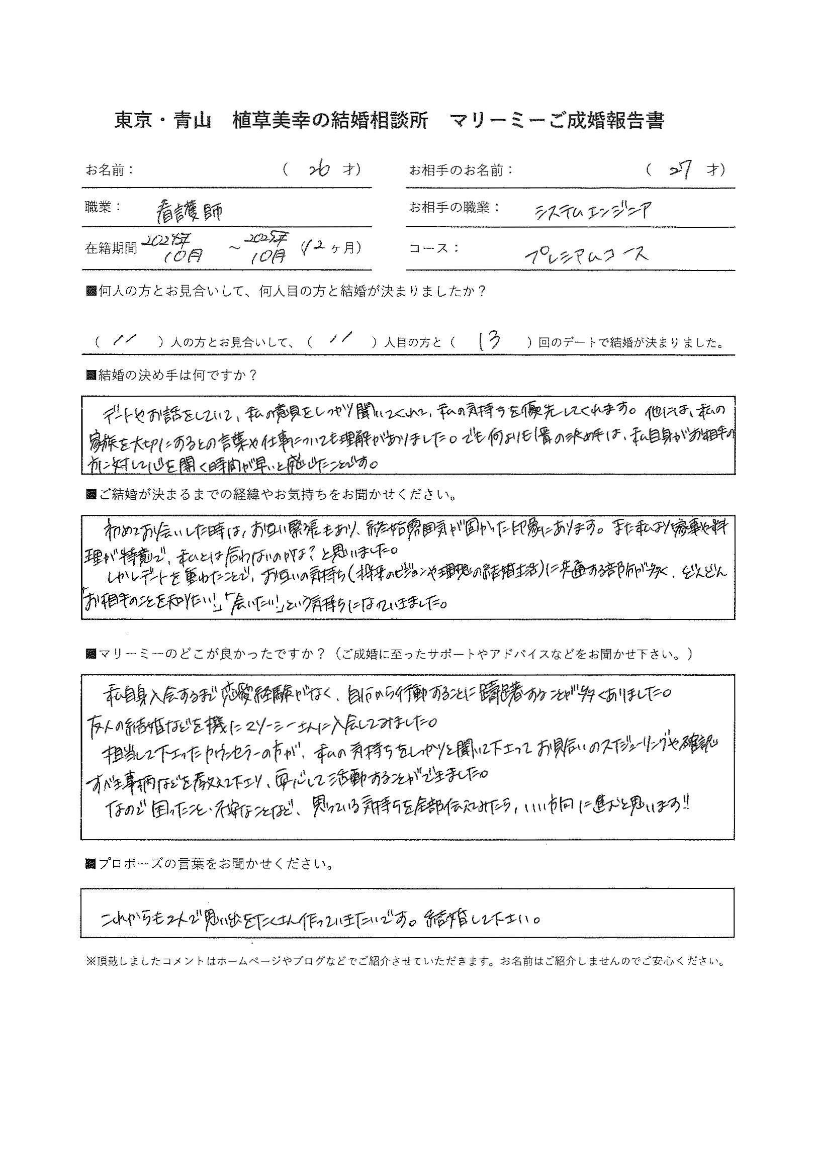 26歳看護師女性×27歳システムエンジニア男性のご成婚