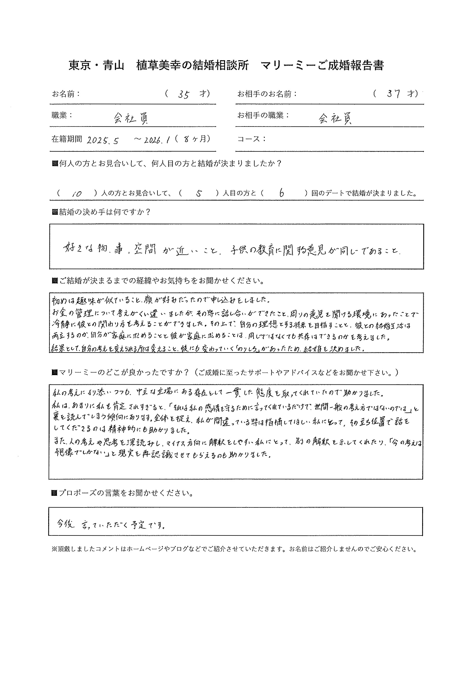10 人の方とお見合いして 5 人目の方と 6 回のデートで結婚が決まりました。