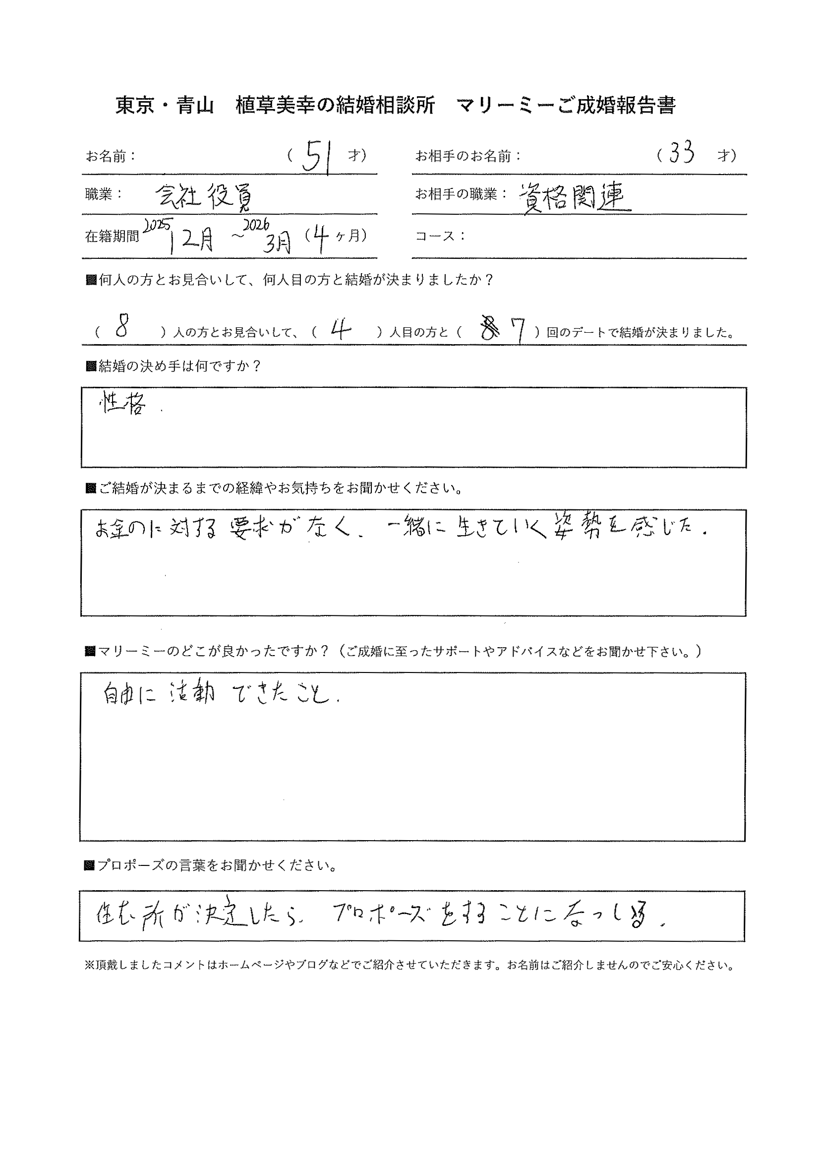 51歳会社役員男性×33歳資格関連職女性のご成婚